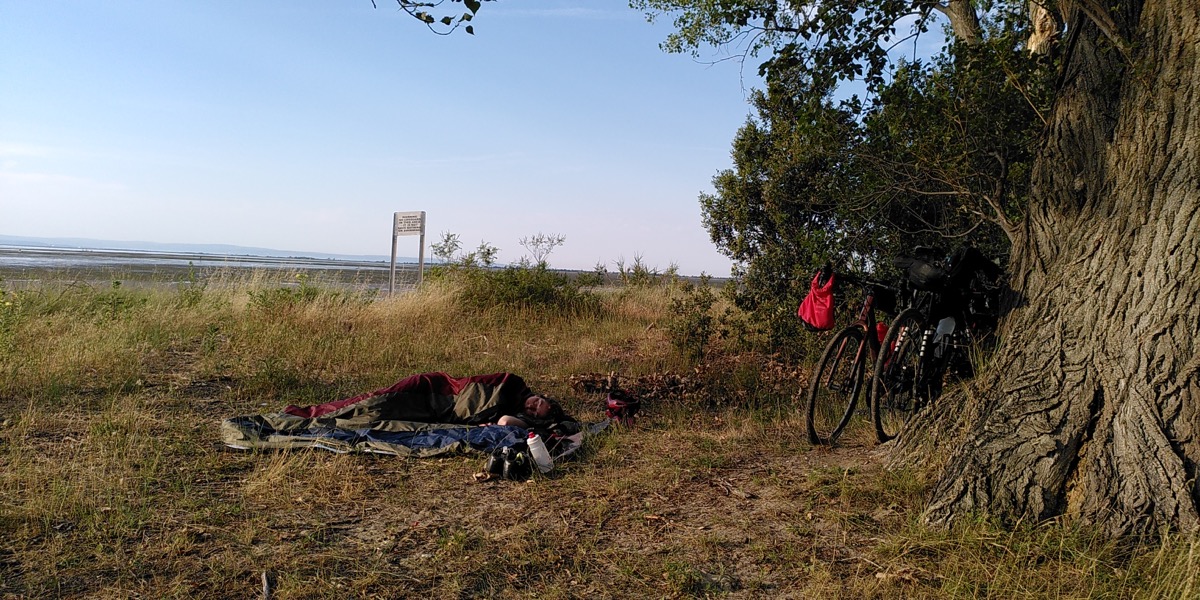 stánky a kašnami. Tady nic. Prostě prázdná štěrková plocha. Chtěli jsme si dát pizzu, to bohužel neklaplo.Naštěstí jedeme kolem Lidlu, nakoupíme svačinu, večeři, druhou večeři a snídani a s tím vším se usadíme v miniparčíku hned naproti. Kousek stínu najdeme pod sochou partyzána nebo koho. Pokračujeme v jízdě, míjíme zbytky římské stavby a světe div se, moře! My jsme to dokázali, jsme v Gradu! Teda ještě ne úplně, zbývá posledních pět kilometrů po silnici “skrz moře”. Přímo v Gradu se posadíme na promenádě a spokojeně pozorujeme zapadající slunce.