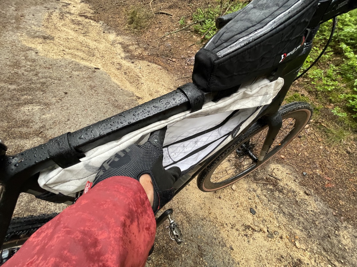 Já se v tomto dnešním článku budu věnovat rámové brašně. Mnou objednaná brašna je v bílo šedé kombinaci. Brašna je ušita z všeobecně známého materiálu X-Pac a uvnitř je vybavena polyesterovou podšívkou se zátěrem a zipem YKK s poutkem pro lepší otvírání. Brašna je jednoduchého střihu a směrem k vidlici se mírně rozšiřuje. Zip je chráněn chlopní, které je dostatečně široká a zip zcela kryje. K přichycení k rámu je brašna vybavena pěti suchými zipy, které jsou napevno všity do brašny. U suchých zipů se chvilku zdržím. Zipy sami o sobě jsou v pořádku, ale já bych přeci jenom uvítal možnost volby, kde mít suchý zip umístěný. Pevné našití je dost svazující a to především v oblasti vrchní rámové trubky. Zde bych uvítal možnost změny pozice zipu, protože takhle se mi stalo, že jsem některé vrchní brašny nemohl na kolo umístit vzhledem ke vzájemně stejné pozici suchých zipů. A přední suchý zip, kterým je brašna přichycena k spodní rámové trubce, bych uvítal delší. Vzhledem k šířce trubky mého kola tam zip drží na kousku, ale je pravda, že se mi ani jednou neodlepil.