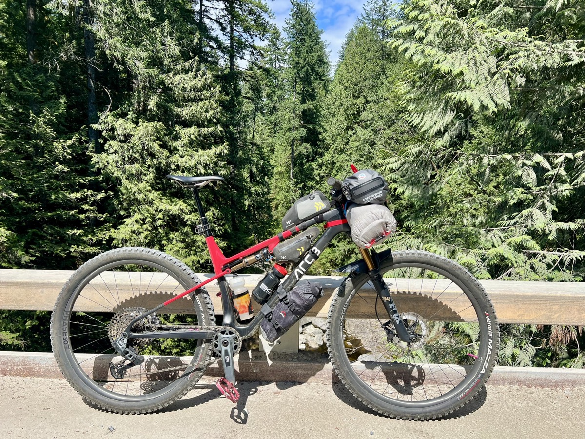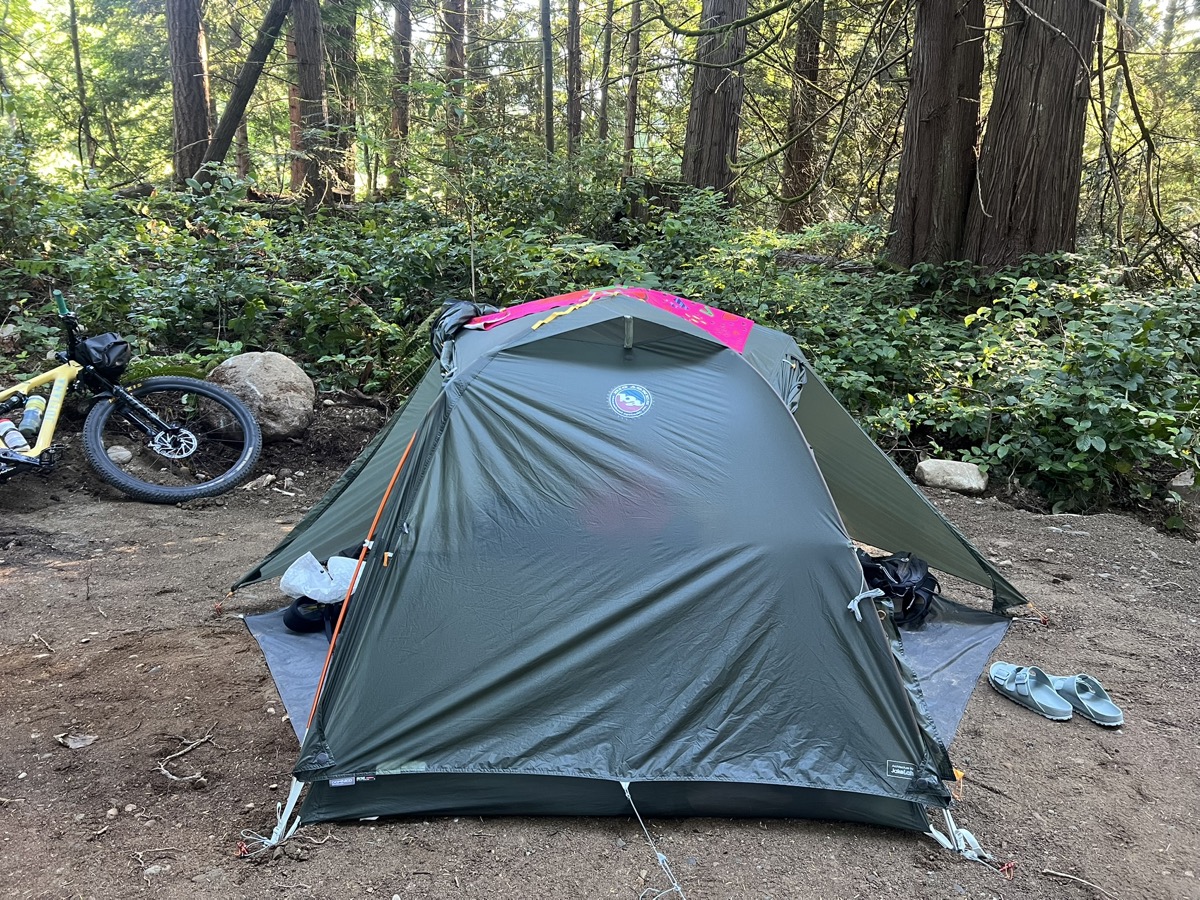 Co se prostoru týče, krom stanu by se vešlo do brašny i další oblečení nebo spacák či karimatka. Jenže, co když zaprší a budeš muset ráno balit mokrý stan? Chceš si k němu sbalit spacák nebo oblečení? Nechceš. Takže na to nemůžeš spoléhat jako na úložný prostor, pokud tedy nejedeš někam kde fakt neprší. Jestli jedeš na silniční nebo i gravel bikepacking a máš možnost si vzít velkou zadní a rámovou brašnu, tak není problém mít jako přední brašnu pouze stan. Naše letošní cesta po Vancouver Islandu byla trochu složitější. Nebyl v plánu jen bikepacking, ale taky hodně ježdění nalehko a spíš bikepackingové přejezdy terénem a taky nějaká práce na etapáku BC Bike Race. Potřebovali jsme tedy víc věcí než obvykle. Na bajka tedy trochu nezvykle balím velkou zadní podsedlovku, přední brašnu na harness a na to přidělávám stan. Tohle řešení není ideální, občas se u toho rozčílím, při troše snahy ale funguje a vše drží jak má. Akorát to teda není už tak rychlé jak pouhé přidělání přímo na řídítka. Za to ale brašna nemůže 😊