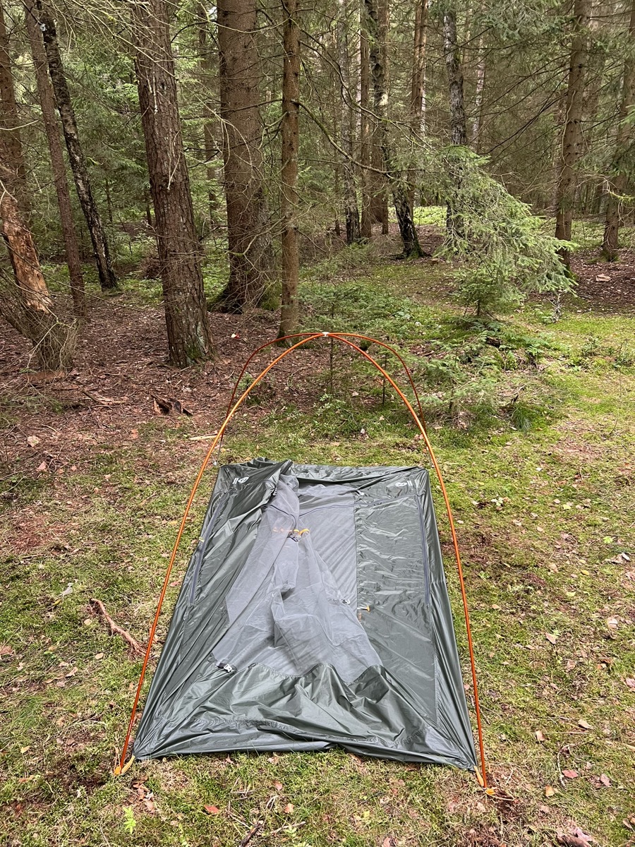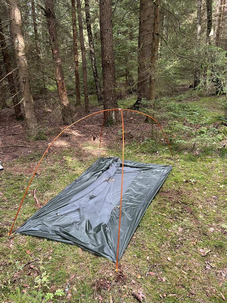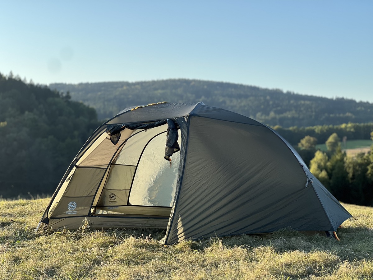Stan se pyšní dvouplášťovou konstrukcí a jeho stavba je velice jednoduchá. Vnitřní stan rozložíš na zem, vyndáš kratičké (30 cm) tyčky, samy do sebe naskáčou. Řešíš jen stranu která kam. Jak už jsem psal výše, stan je kónického tvaru, a tak je pomyslné X z tyček u hlavy s větším rozpětím, je to dobře rozpoznatelné a jednoduché. Tyčky i kolíky jsou od věhlasné značky DAC. Výhodou takhle krátkých tyček je, že je můžete sbalit i jinam než do samotné brašny na stan, vejdou se pohodlně i do rámovky. Jediné, co bychom vytkly je barva obalu, jak tyček, tak kolíků. Tmavě zelená je fakt neviditelná a hodně krát se nám stalo, že jsme je pohledem chvíli hledali 😊
