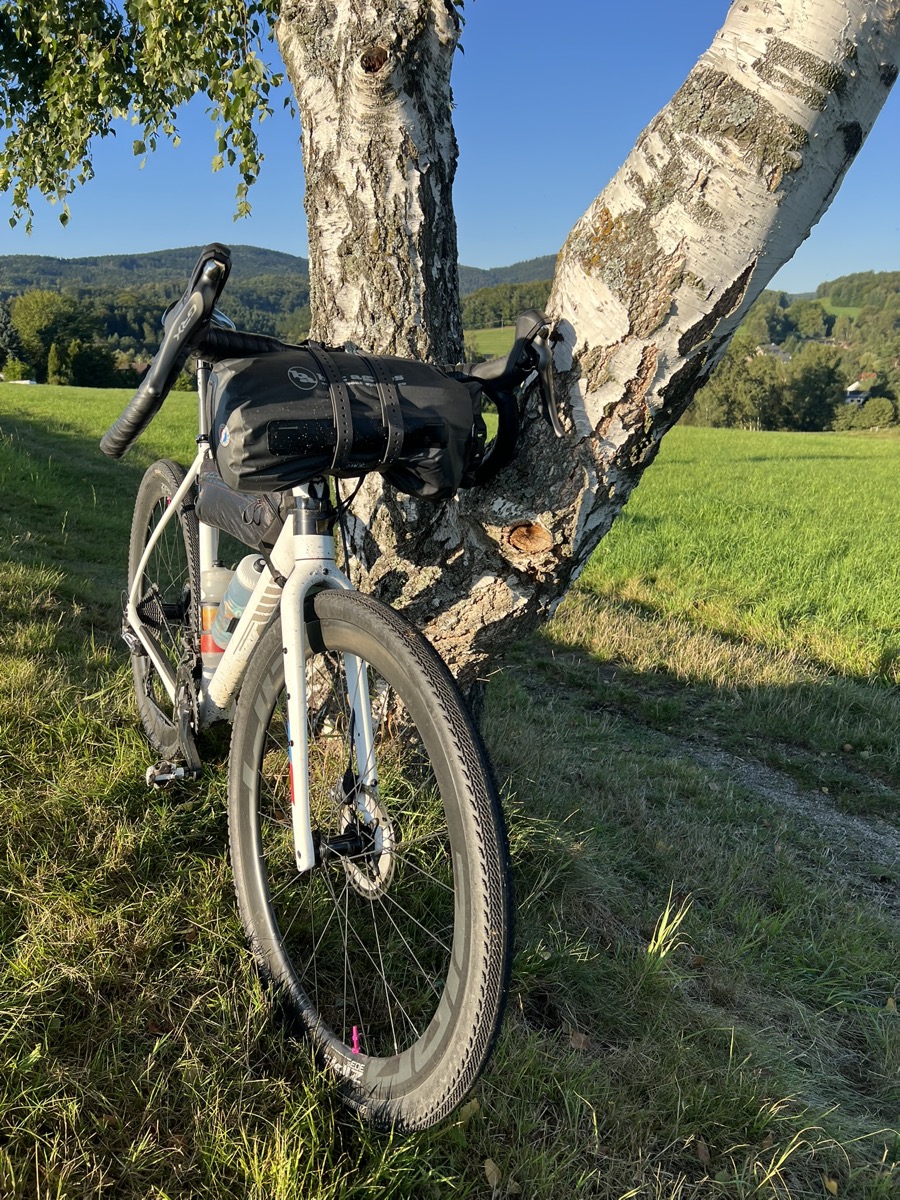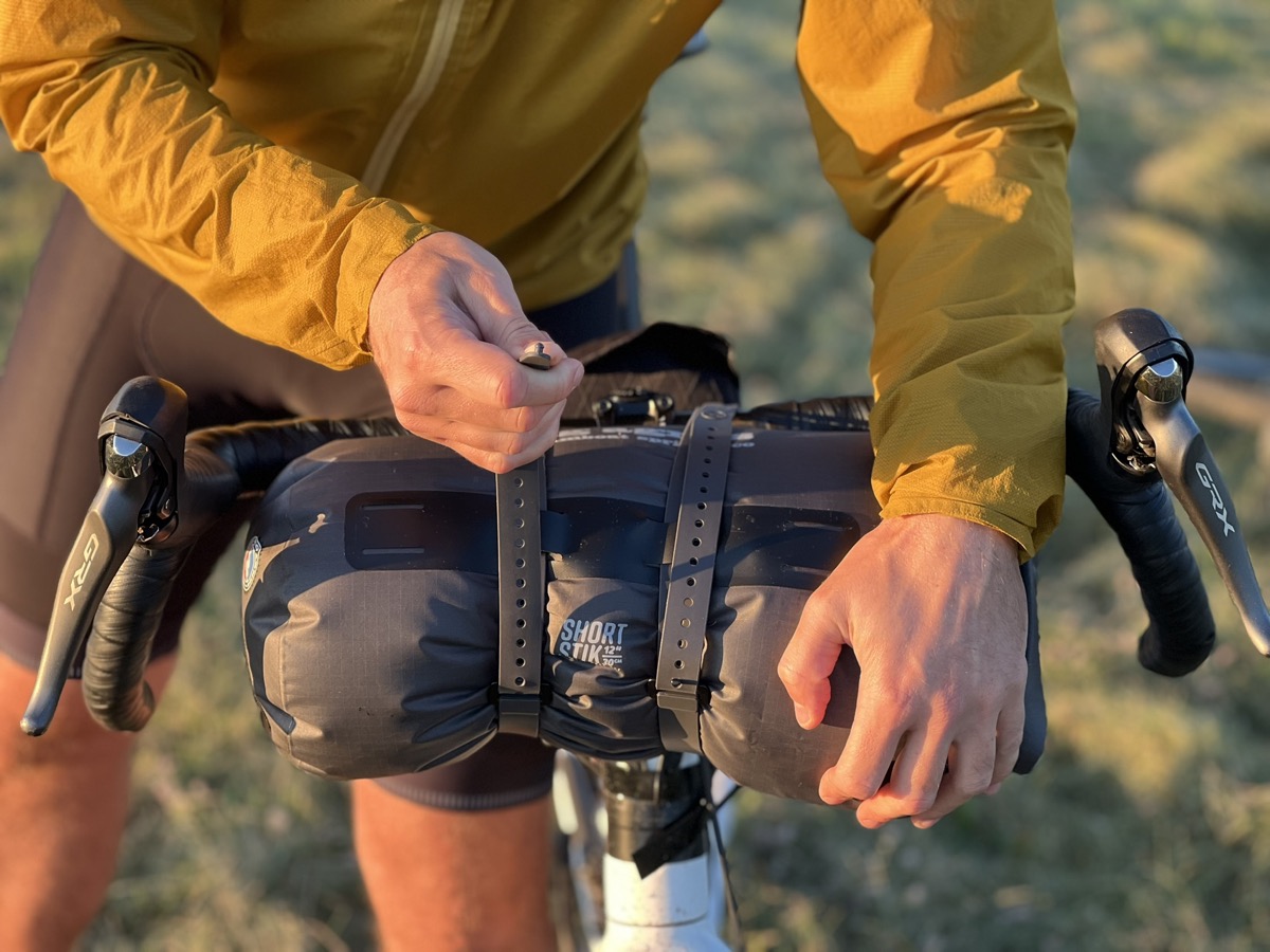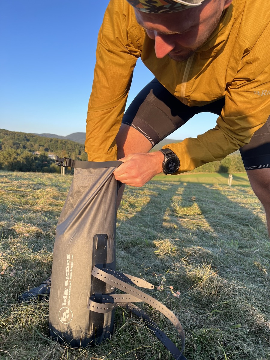 Kluci z Nalehko mě upozorňovali, že brašna se hodně posunula, vypadá skvěle, vychytaně a že budu nadšený. Stan jedu vyzvednout na gravel kole s berany. Když ho vidím poprvé, jsem opravdu nadšený. Jednoduchý nepromokavý pogumovaný drybag s vlastními popruhy ala Voile Straps, otevíratelný z jedné strany s rolovací přezkou. Říkám si jo, to je přesně ono. Krásně kompaktní.