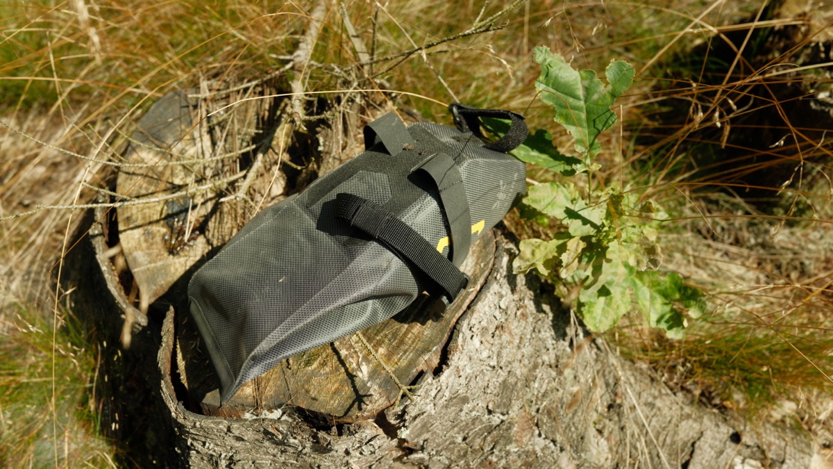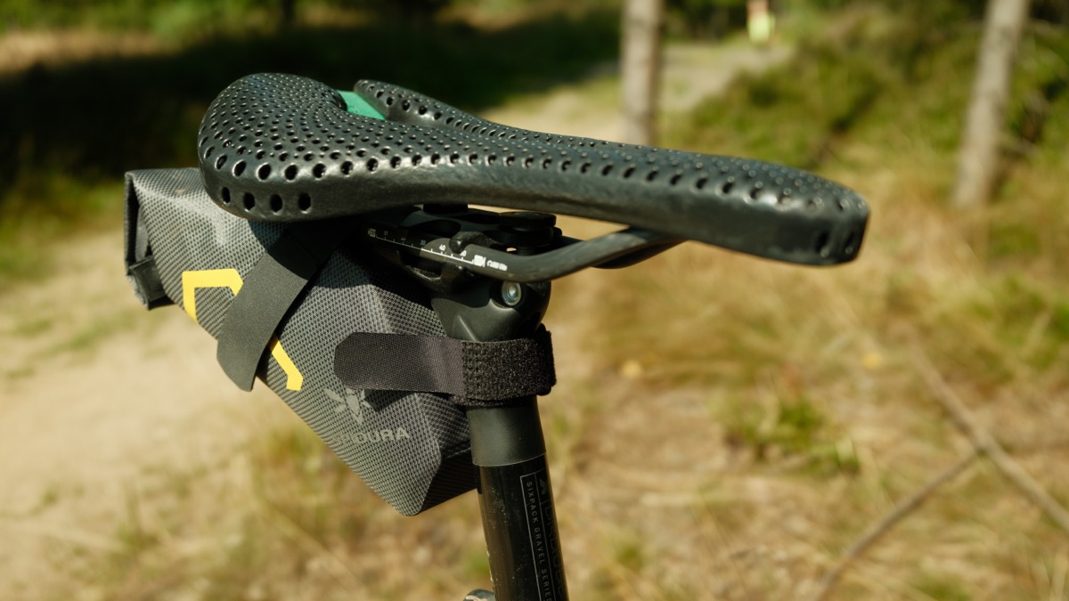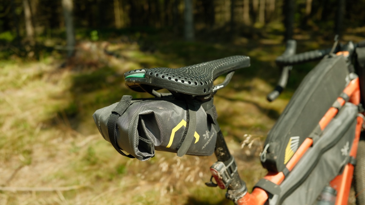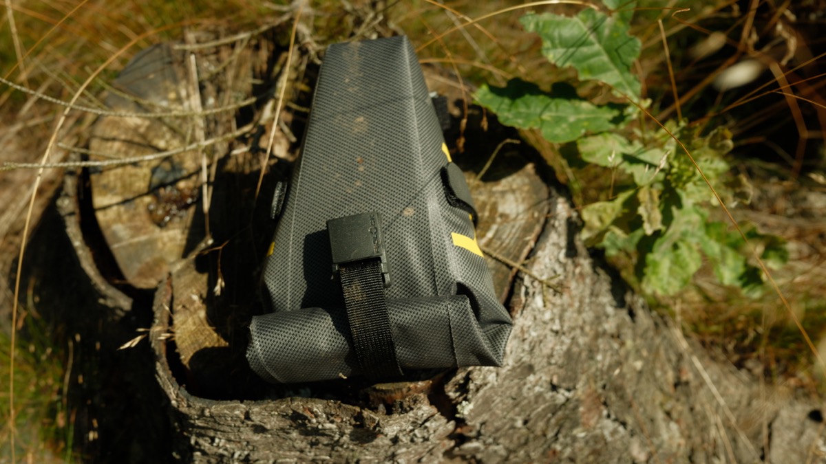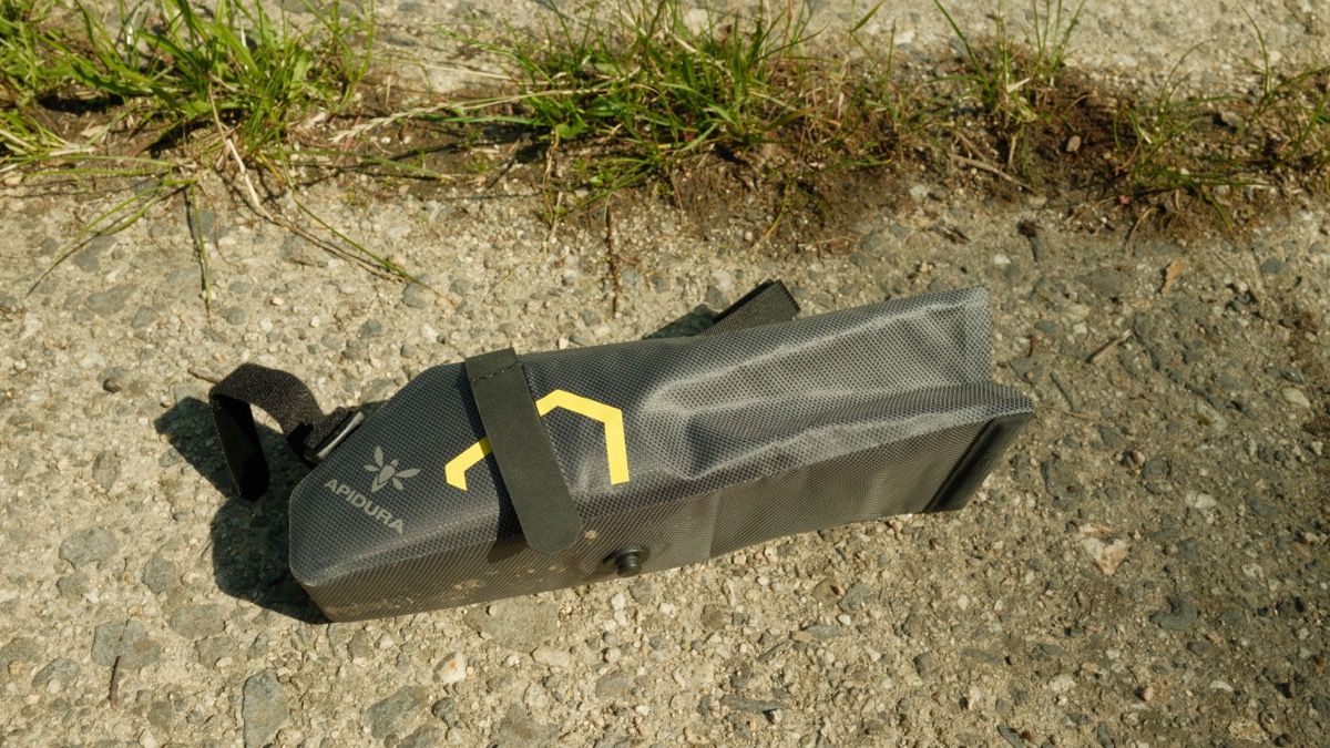 Materiál – tady mi to Apidura usnadňuje. Je to jejich vlastní materiál Trilon, který je nepromokavý. Brašna, jak je teď zvykem, je kompletně svařovaná. K uchycení slouží jeden suchý zip na sedlovou trubku a další dva suché zipy na lyžiny sedla. Rychlé, snadné a poměrně stabilní. Akorát suchý zip na sedlovou trubku mi přijde extrémně dlouhý.