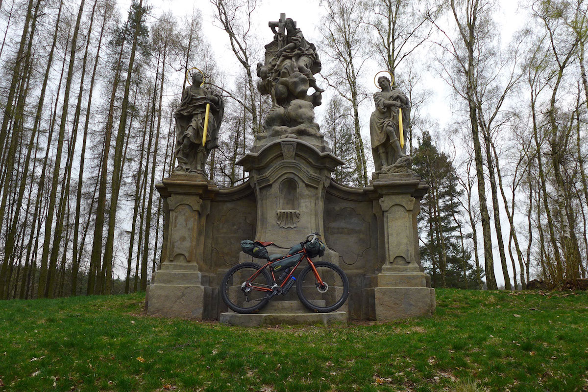 Ráno kontrolují stav oblohy a teploměru. Zataženo, ale zima nijak velká. Nasedám a vyrážím. Prvním cílem je rozhledna Rašovka, poté dlouhý sjezd do Domoslavic, kde odbočuji na Starý dub a dále na Osečnou, ve které, plánuji sjet z frekventované cyklostezky na Hamr a pokračovat kolem Ploučnice. Na kraji Osečné si udělám krátkou přestávku u sousoší Tří Svatých.