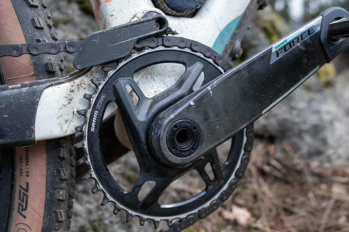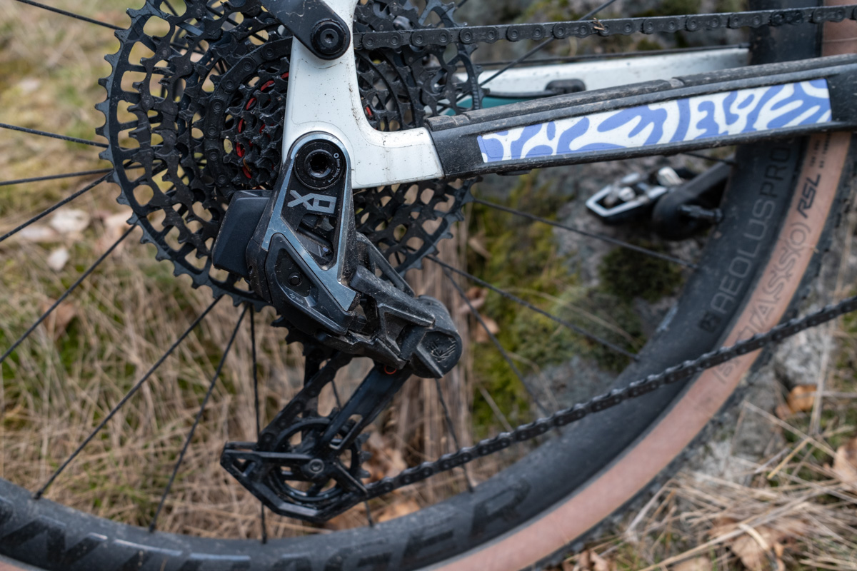 Vaše zadnice spočine na sedle Verse Short Elite. Sedlo je upevněno na teleskopické sedlovce RockShox Reverb AXS se zdvihem 100 mm. A jak už je vidno z názvu, jedná se o bezdrátově ovládanou sedlovku. Baterie trochu ční nad vrchní rámovou trubku. Někomu se to nemusí líbit, mně to nevadí. Zde malé upozornění: prosím, neotáčejte tu baterii! Sice to na první pohled jde, ale uvnitř jsou kabely ovládání a otočením je nenávratně poškodíte – a reklamace se na to nevztahuje. K sedlu nic psát nebudu. Zadnici mám tak osezenou, že stejně nic nepoznám, takže ode mne nic převratného nečekejte. Co se týče sedlovky, ta funguje na jedničku, je rychlá a zdvih 100 mm je dostačující. Dokonce ani s brašnou na nosiči nedocházelo ke kontaktu mezi sedlem a brašnou. Ale to je také dáno mou výškou. Kdybych měl o asi pět centimetrů méně, asi by se dotýkalo. A jak se ovládá? Jednoduše – současným stisknutím řazení na levé i pravé straně. Když už jsem tedy nastínil ovládání teleskopu, přesuneme se rovnou na řazení a převody. Řazení je SRAM Force AXS E1, kliky taktéž, a to v provedení XPLR E1 s třiceti osmi zuby a délka klik u kola velikosti L je 172,5 mm. Přehazování zajišťuje SRAM X0 Eagle AXS T-Type a pracuje s dvanáctirychlosní kazetou SRAM Eagle XS-1295 s rozsahem 10–52. Vše funguje naprosto bezchybně. Řazení je rychlé a přesné. Co mě zaskočilo, přestože SRAM používám již dlouho, jsou ve verzi Force ještě další ovládací tlačítka na vršku pák z vnitřní strany. Jdou dost ztuha a já si na ně po tisíci kilometrech ještě nezvykl. Snad to časem přijde.
