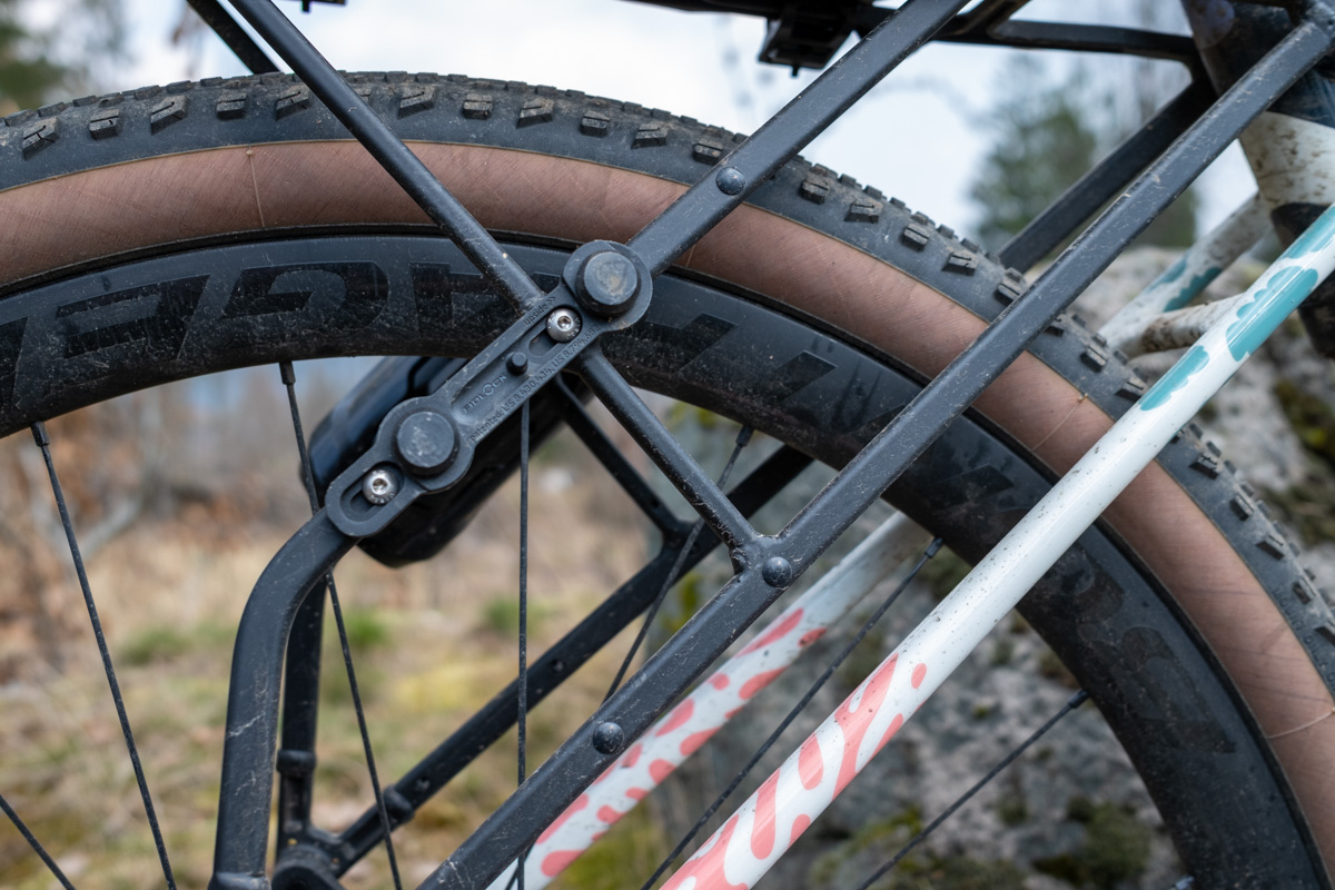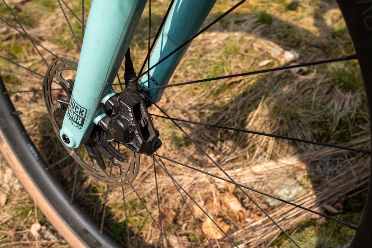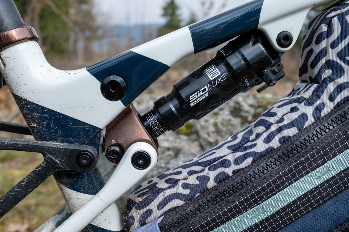 Co nám ještě zbývá? No jasně – to, co je na tomto kole tak zvláštní, a tím je odpružení. Vpředu je zcela nová odpružená vidlice od firmy RockShox s názvem Rudy XL se zdvihem 60 mm. Samozřejmostí je možnost uzamčení na korunce vidlice. Zadní tlumič je taktéž od RockShox, jedná se o SIDluxe Ultimate 3P se zdvihem 55 mm, který lze také manuálně přepínat. Polohy přepínání jsou propedal, zamčeno a otevřeno. Tak a jestli teď čekáte, že vám dám sáhodlouhou přednášku, jak jsem vše přepínal a testoval, zklamu vás – celou dobu testování jsem nechal vidlici i tlumič v otevřené pozici. Ne že bych funkci zamčení nevyzkoušel, to jo, ale prostě jsem po pár jízdách na zamykání vykašlal, protože jsem nepociťoval nějaký extra velký rozdíl. Popravdě se to ale ještě může změnit – přece jen jsem na kole nejel žádný pořádný bikepacking. První řádná společná cesta nás čeká až v dubnu na sraz, takže se to může změnit a já začnu odpružení zamykat. Uvidí se. Moc se mi líbí, jak je běhoun tlumiče krásně schovaný, takže nijak zvlášť netrpí zachytáváním nečistot.