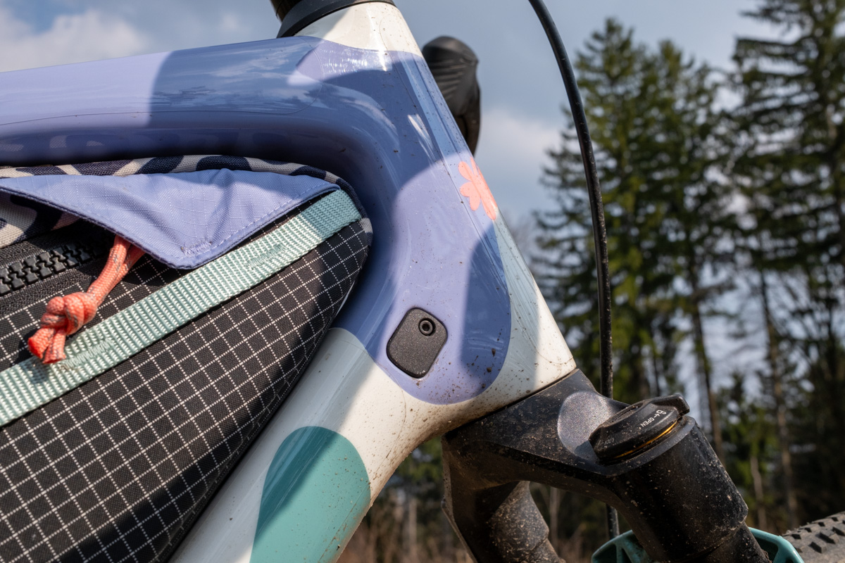Druhou věcí, za příplatek 6 000 Kč, je na kole namontována celorámová brašna, která vznikla ve firmě Topo Designs. Ano, slyšíte dobře, je namontována šrouby, takže se ani nehne a drží na svém místě. A jak jsem poněkud haněl nosič, tak tady budu pět pouze samou chválu. Něco tak kvalitního a dobře vymyšleného jsem na kole snad ještě neměl. Brašna je vyrobena z recyklovaného nylonu a je stejně barevně ulítlá jako barva kola. Hlavní kapsa je rozdělena přepážkou na suchý zip, kterou lze jednoduše vyndat a obě komory tak propojit do jedné velké. Vnitřek je svítivě žlutý, takže se v ní vše příjemně hledá. Z druhé strany je další velká kapsa, která je vybavena dalšími vnitřními kapsami. Na stejné straně je z vnějšku ještě jedna menší síťovaná kapsa na drobnosti. Zavírání zajišťují kvalitní velké zipy YKK. Vše je naprosto špičkově zpracované a celkový objem je pět a půl litru. Na brašně je jednoznačně vidět, že ji dělá někdo, kdo bikepacking jezdí a má ho rád.