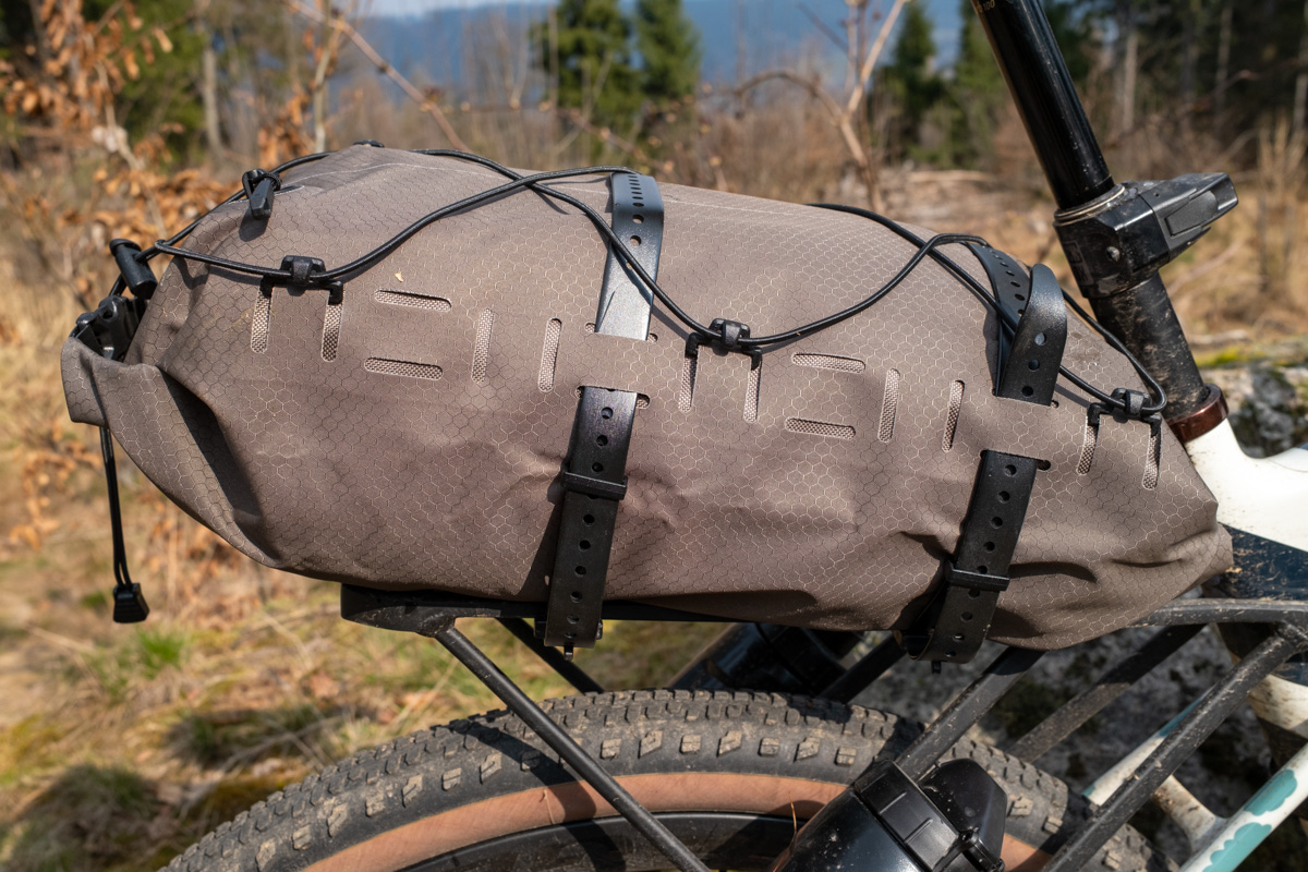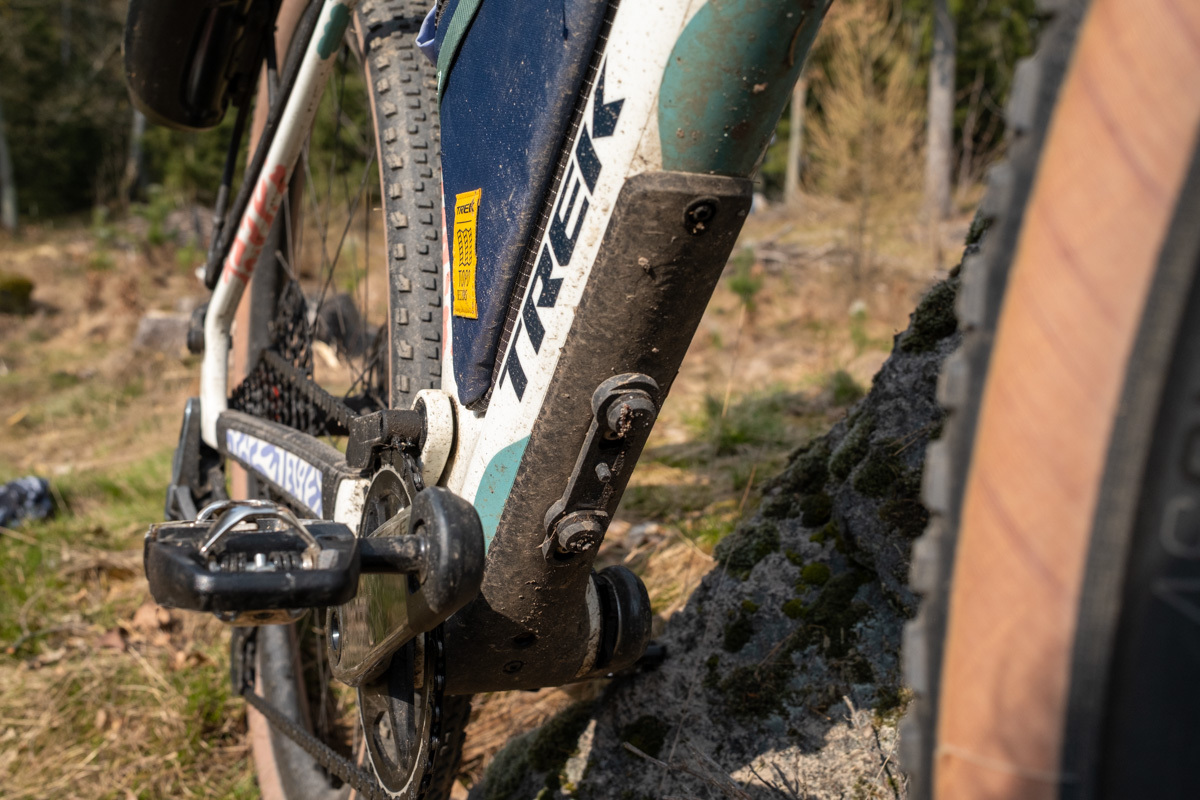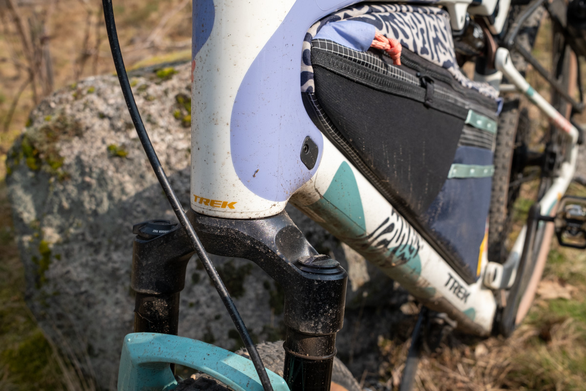 Tou první je integrovaný nosič (dá se jednoduše odmontovat). Nosič je zvláštní především tím, že jeho integrace je provedena tak, aby kopíroval pohyb zadního odpružení. Navíc na něm naleznete čtyři montážní body na přichycení třeba košíku na bidon. Já, vzhledem k velikosti chodidla, mohu používat pouze výše položenou montáž, protože jinak bych nemohl šlapat. Nosič ve mně nejprve vzbudil nadšení, které se po pár dnech změnilo ve frustraci. Montážní body jsou skvělé, ale celý nosič má pro mě jedno velké ale. Jakou a hlavně jak na nosič uchytím brašnu? Na propagačních fotografiích je na nosiči uchycena originální podsedlová brašna Bontrager. Při bližším pohledu ale lze zjistit, že je přichycena něčím, co připomíná Voilé strap, který ale není součástí brašny a navíc je potřeba mít ho v pořádné délce, takže originální brašna se ukázala jako krok špatným směrem. Prostě tak dlouhé popruhy v dílně nemám a zatím jsem se nedostal k jejich objednání. Dalším krokem bylo tedy prohlédnout všechny vaky, co mám v dílně. Jako nejlepší se ukázal Revelate Designs, ale nemám ty popruhy, sakra! Nakonec jsem našel od firmy Ortlieb dry-pack o objemu dvanácti litrů, a to včetně dostatečně dlouhých pásků. Brašna dorazila a ouha! Pásky jsou super, ale v Treku se rozhodli, že nosič nebude mít kruhový průřez, ale bude z plochého profilu. Chvíli jsem nadával, ale nakonec se mi přece jen podařilo přijít na způsob uchycení. Drží to, ale za mě to ideální není. Škoda, že na toto v Treku nemysleli a s kolem nepřišli rovnou i s nějakou brašnou určenou pro tento typ nosiče. Snad je to napadne časem.