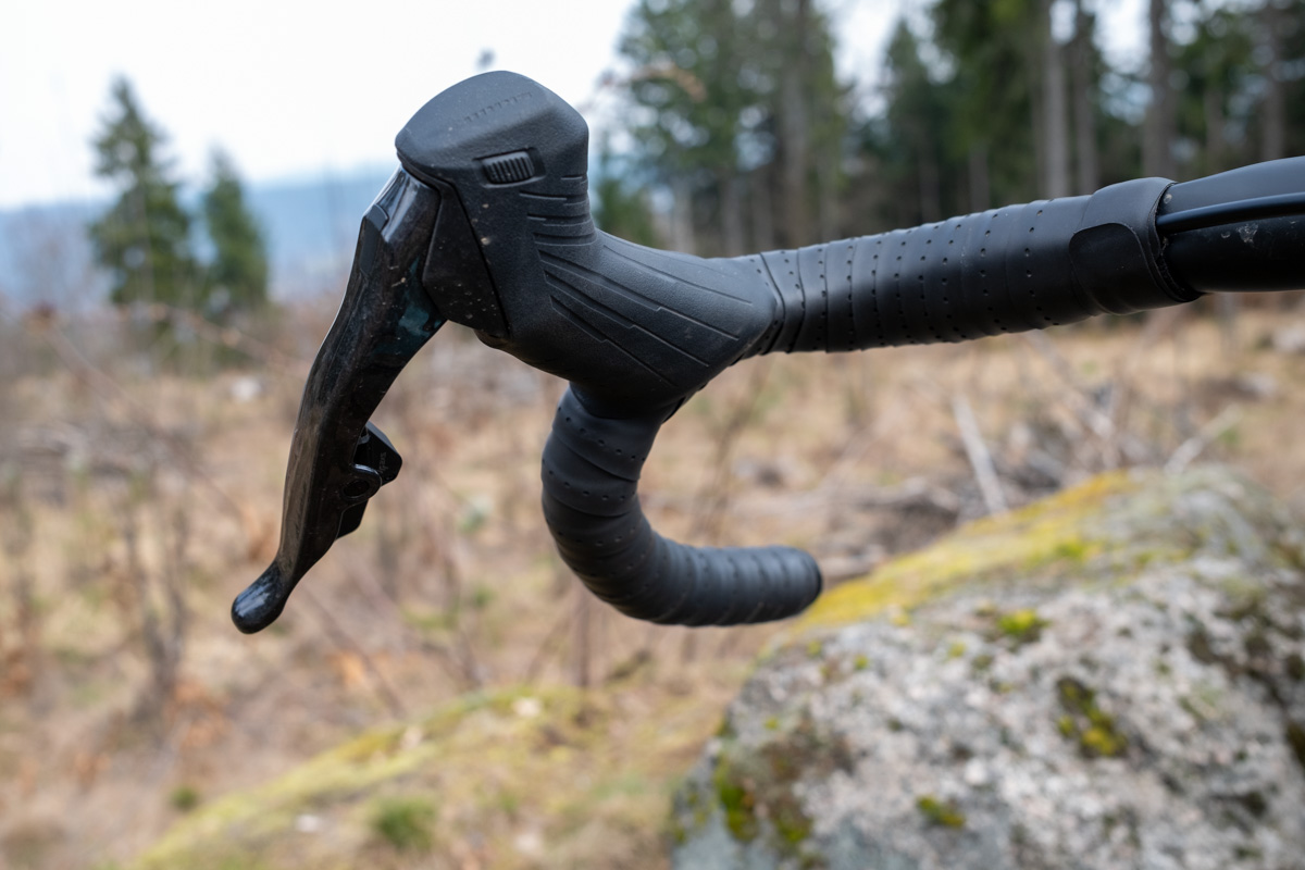 Brzdy SRAM Force. V dřívějších dobách jsem brzdy SRAM dost haněl, v posledních letech ale výrobce udělal značný pokrok a já nemohu říct ani popel. Prostě brzdí, a to velice dobře. Několikrát se mi během testování stalo, že jsem vjel do nečekaného sjezdu a nestihl jsem jít do spodního úchopu. Přesto jsem bez problémů vše dobrzdil jedním prstem ve vrchním úchopu. Dřív bych si to na brzdách SRAM nedovolil.