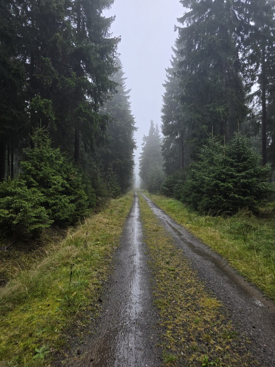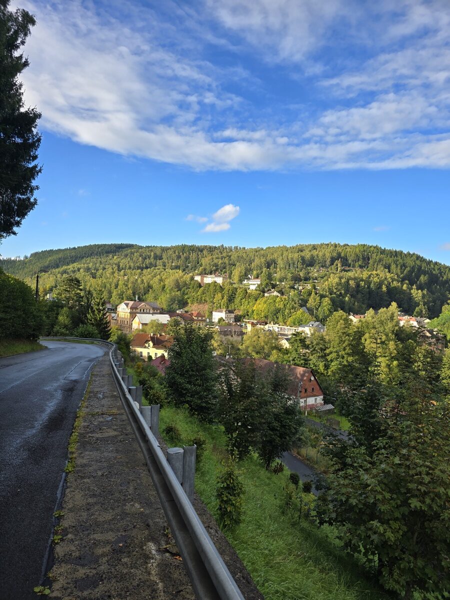 Noc byla bez problémů, vyspal jsem se dobře a mám plno energie na dnešní, ne zrovna krátkou cestu z Nejdku do Tisé. Zabalím kolo a jedu. Stoupám po silnici hustými lesy do Abertamů, kde si dávám snídani. Mají tu koblihy s náplní Kinder Bueno – a to je tedy dobrota!