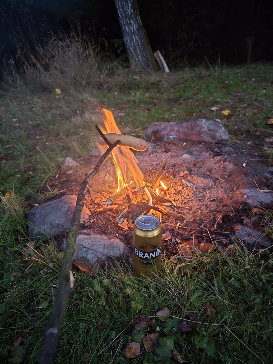 Projedu okrajem Nejdku a jsem na místě prvního spaní. Je to menší oplocená louka, kterou protéká říčka Rolava. Je tu ohniště s posezením a suchý záchod. Postavím tarp, připravím spaní a jde se rozdělat oheň. Chvilku trvá, než se mi to povede. Pomocí švýcaráku uříznu pár větších větví na přikládání a pak už jen opékám a spokojeně popíjím pivo.