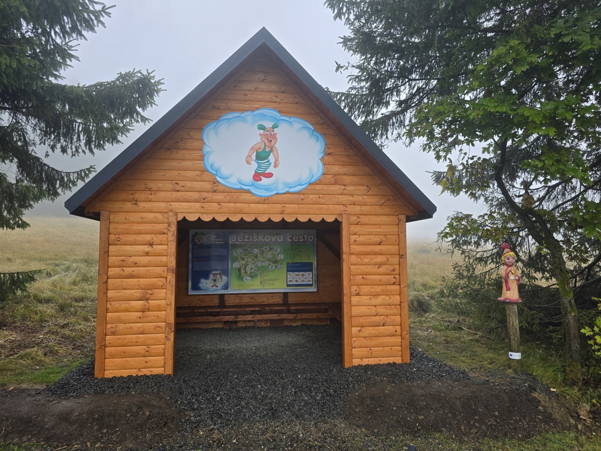 Za Abertamy sjíždím ze silnice a připojuji se na Ježíškovu cestu. Potkávám několik přístřešků, u kterých je socha Ježíška, a u jednoho z nich je bývalá samota Špičák – zřícenina s posezením a krásným výhledem.